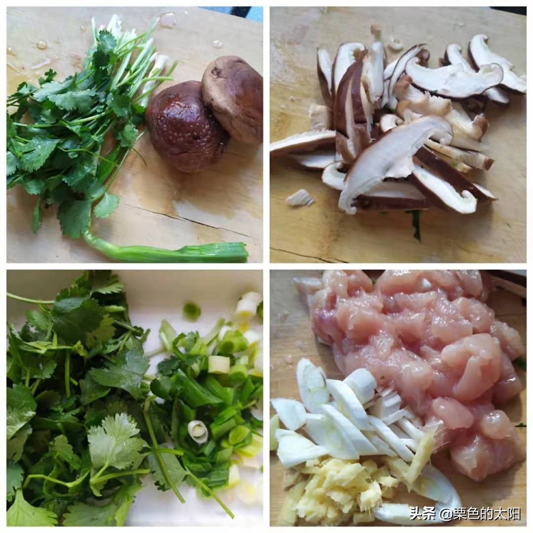 1.香菜一小把,去根洗净,蒜苗两根洗净,把香菜和和蒜苗分别切碎;香菇两朵洗净,切成薄片;鸡胸一块洗净,切成丁状;准备葱花和姜丝少许;
