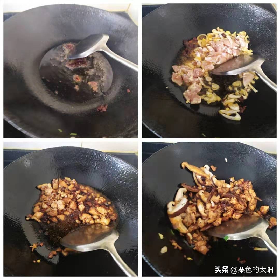 2.炒锅入油烧热,下入一勺郫县豆瓣酱,炒出香味来;之后下入葱姜和切好的鸡胸进行煸炒;加入胡椒粉、料酒、食盐、生抽、老抽,炒制片刻之后倒入香菇片进行翻炒;