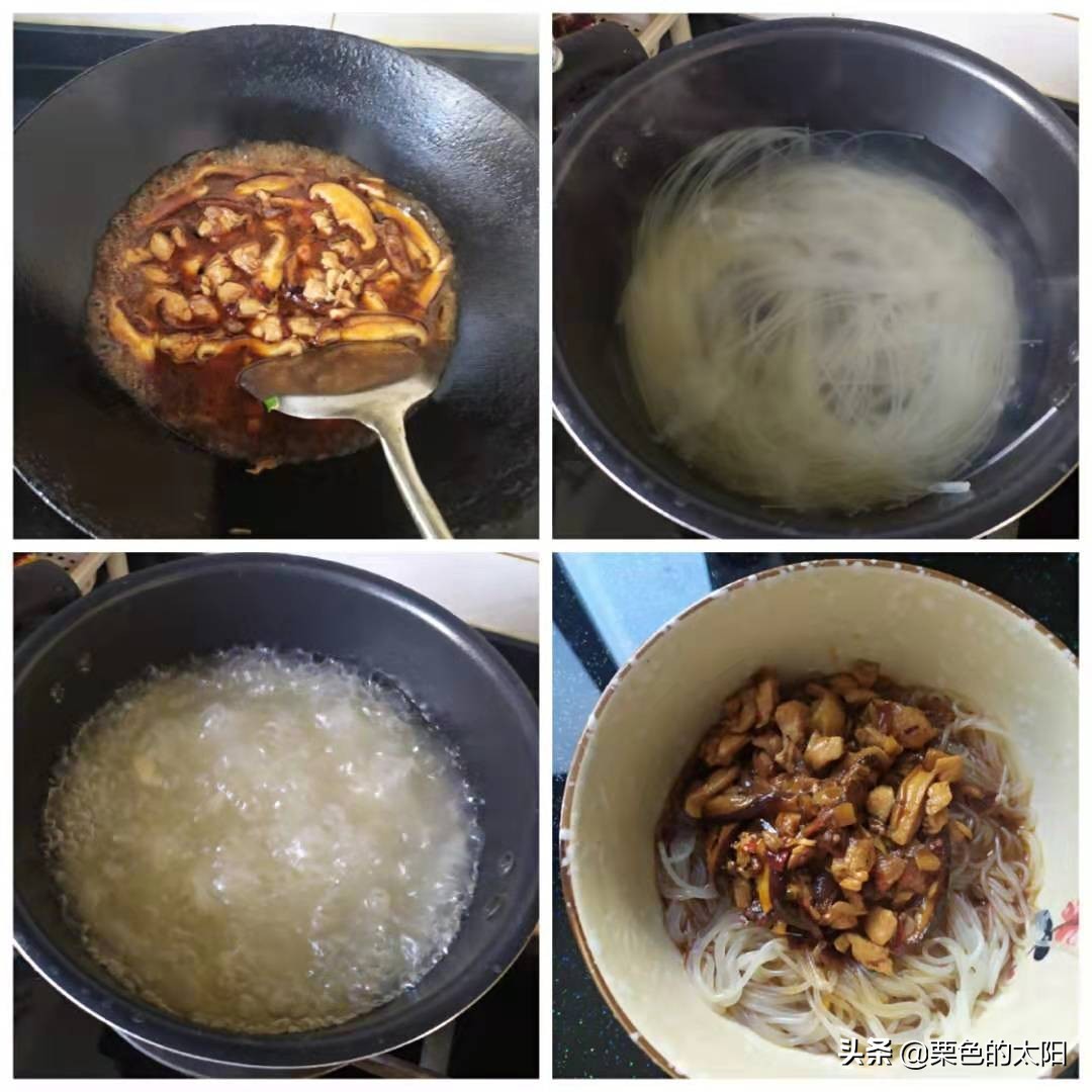3.续入适量开水,炖煮几分钟之后关火;米线提前浸泡一下,稍微发软即可;汤锅加水烧开,倒入泡好的米线,煮沸至成熟;取一个大碗,捞出米线,再盛入一大勺鸡丁卤;