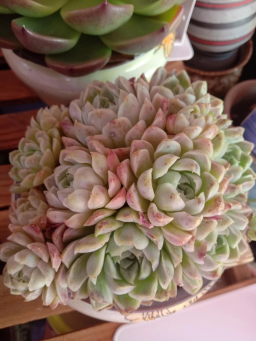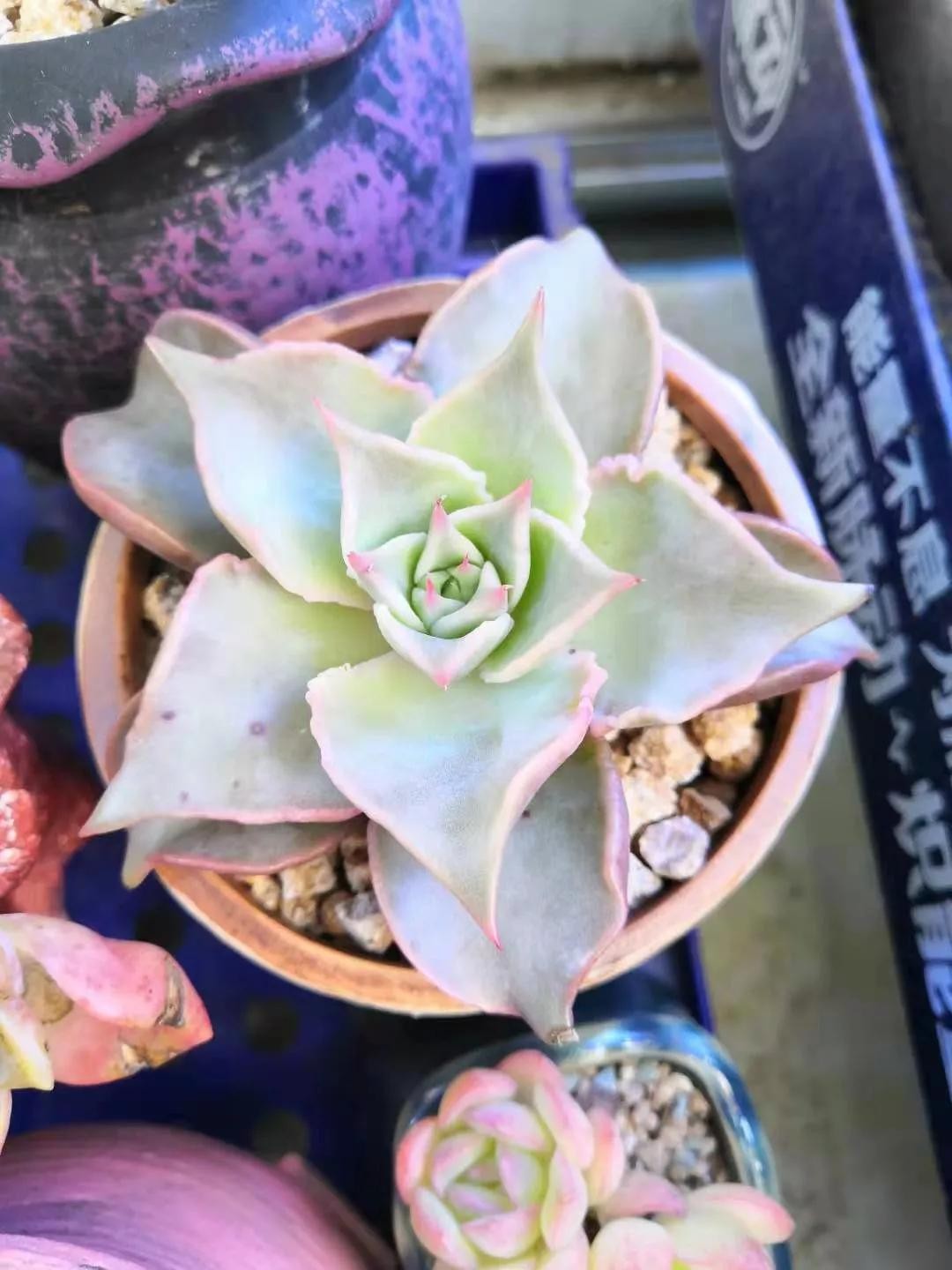 配土:篮姬莲喜欢疏松,透气的土壤,在给它配土时用20%的泥炭土,80%的颗粒土搅拌均匀即可。如果是小苗可以把泥炭土的比例提高到40%,这样有利于小苗快速长出根系,提高多肉的成活率。上盆前盆底放点陶粒做为滤水层,上盆时放点小白和小粉,这样能有效预防虫害和菌害,上盆后把它放到通风好,有散光的地方,温度最好控制在15度到25度之间,这样它基本15天左右就能服盆。