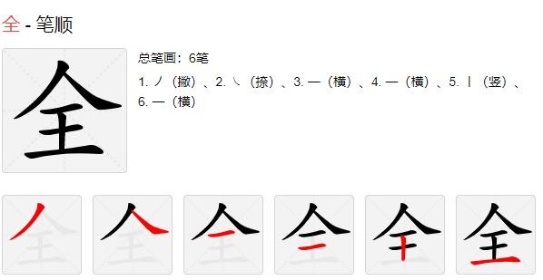 “ 全 ”的笔顺:撇,捺,横,横,竖,横