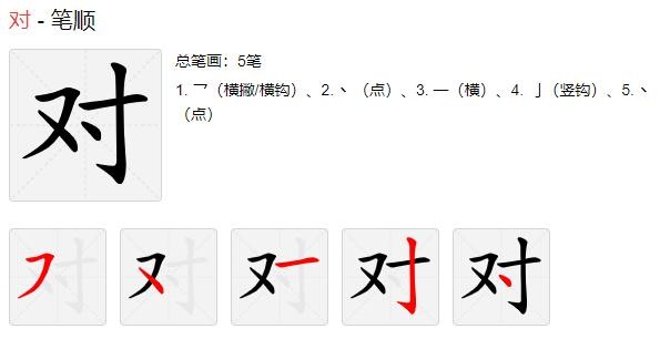 “ 对 ”的笔顺:横折,点,横,竖折,点