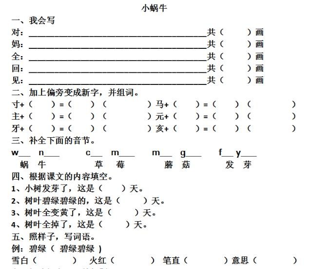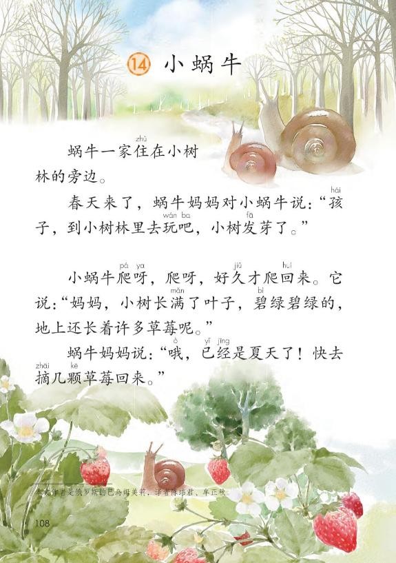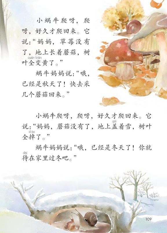 前言:这篇课文是一篇富有童趣的科普童话,通过小蜗牛三次去树林里的故事帮助学生了解一年四季的不同特点和蜗牛爬得慢的特点。课文内容与学生生活实际联系密切,可自然引发学生的思考、感受,进而引导学生表达。本文讲了从春天到秋天,妈妈派小蜗牛到树林里玩,顺便看小树发芽,摘草莓,采蘑菇,可小蜗牛每次都没能完成妈妈交给的任务的故事,这个故事告诉我们做事情要抓住时机,还要有自己的判断。