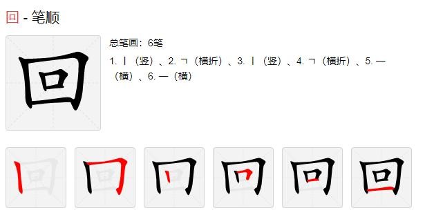 “ 回 ”的笔顺:竖,横折,竖,横折,横,横