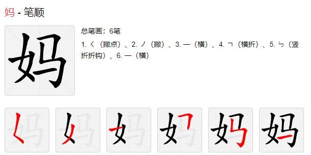 “ 妈 ”的笔顺:撇点,撇,横,横折,竖折折钩,横