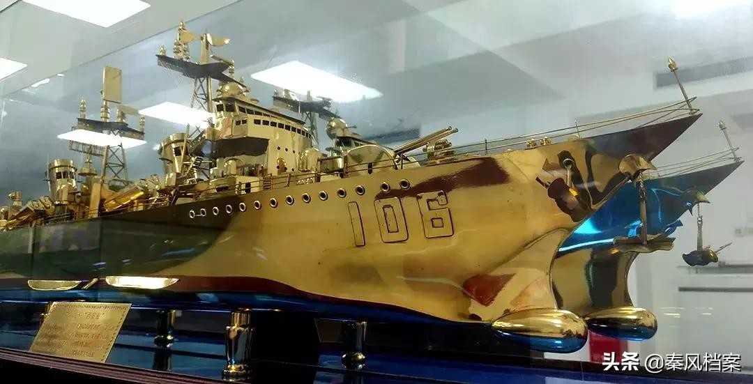 该舰长132米,宽12.8米,桅高29.9米,最大排水量3800吨,最大航速36节。主动力为4台高压蒸汽锅炉、2台主机,7.2万匹马力,5台发电机组。主要武备系统有:双130主炮2座、双37舰炮4座、双25舰炮4座、三联装导弹发射架2座、12管火箭深弹发射炮2座、深水炸弹发射炮4座。于1970年9月下水,1974年11月服役。1986年12月被中央军委命名为“西安”号,为我海军的主力战舰之一。2002年9月,“西安舰”命名15周年之际,海军106舰向西安市政府拥军慰问团赠送了两件“西安舰”礼品模型,一件为全金属制造模型,一件为塑料礼品观赏模型,这两件“西安舰”模型在西安市档案馆收藏陈列展出。