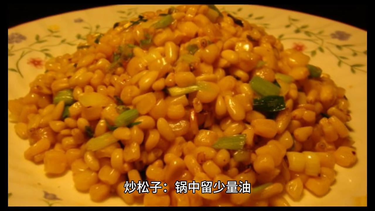 →炒松子:锅中留少量油,加入松子仁翻炒至金黄色捞出备用。