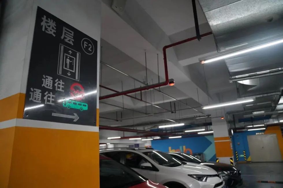 停车场里的每一层楼的标识都很清晰,根据指示牌引导,能快速前往换乘地铁的客梯或楼梯处。