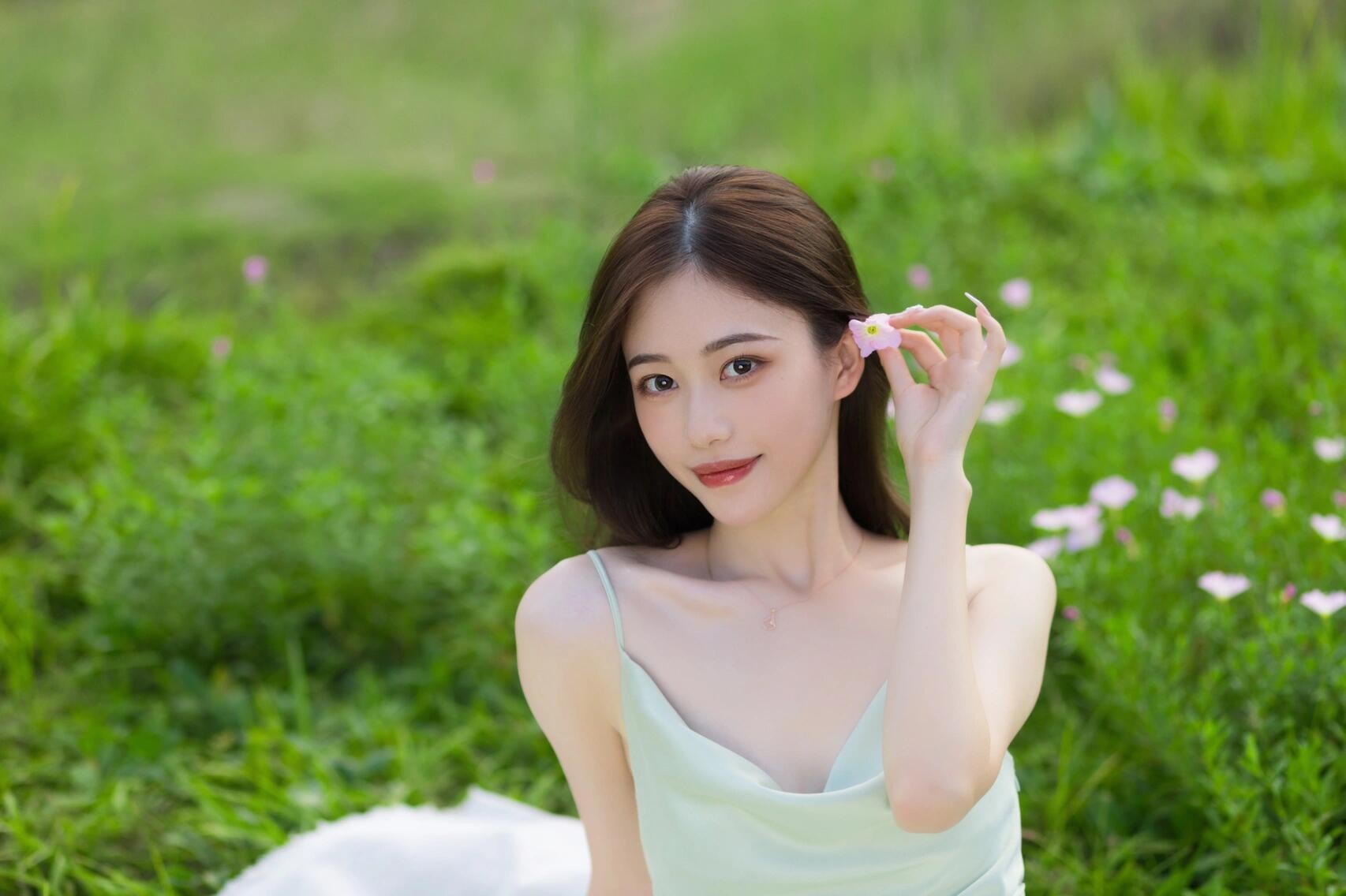 如果你喜欢清新自然的感觉,可以选择拿一朵野花点缀在耳前,然后自然地微笑。这个姿势非常简单,但却能展现出你甜美的一面,草地作为背景,更能凸显照片的自然氛围。