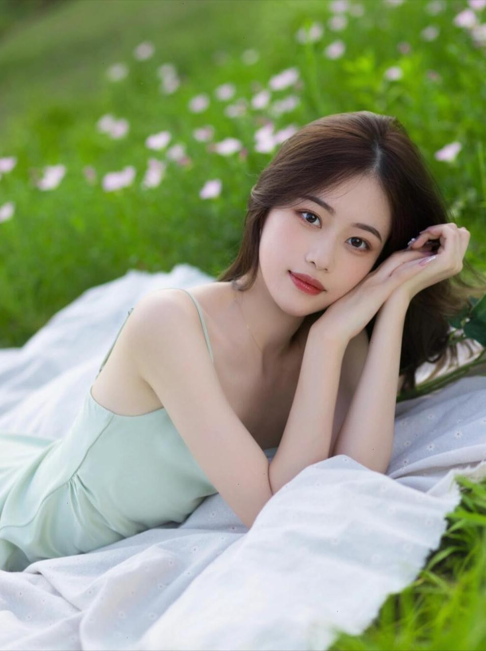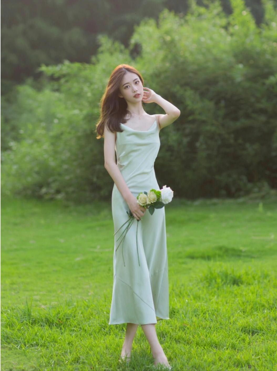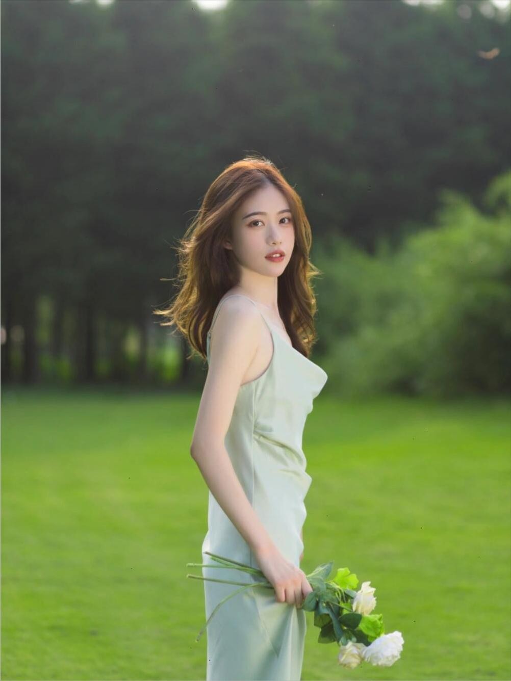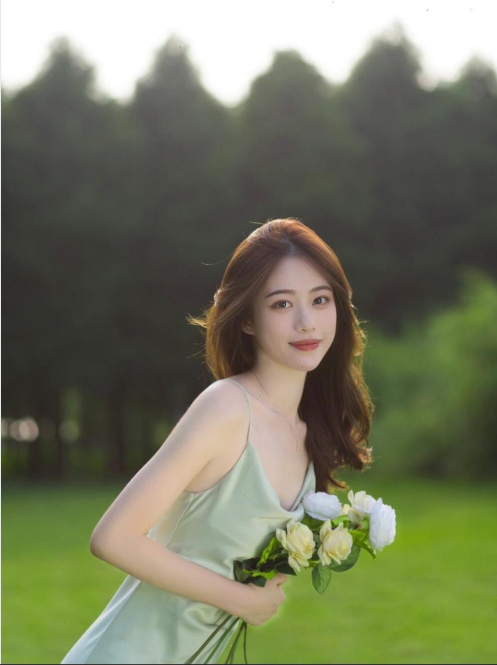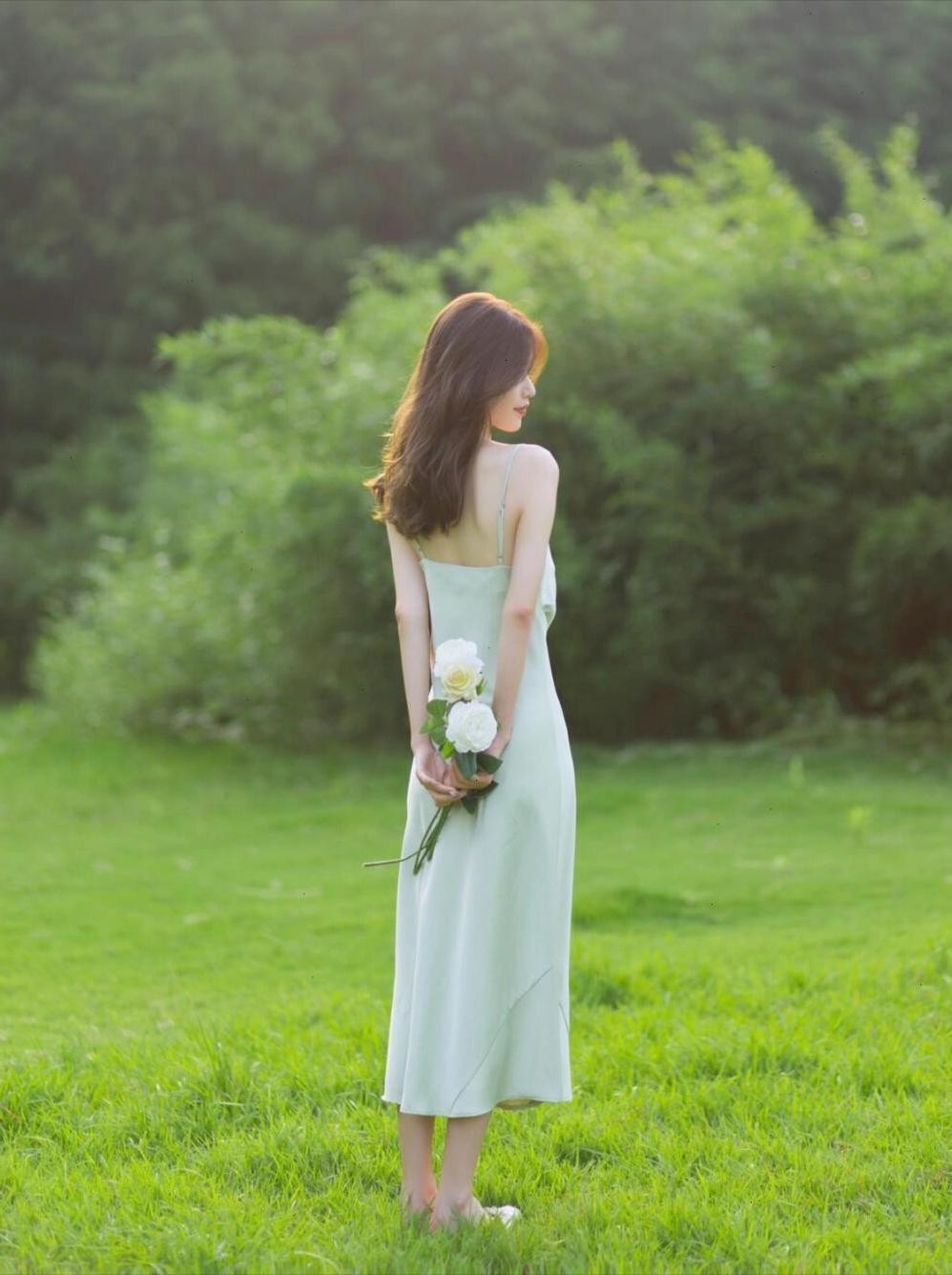 如果你喜欢更加柔美的感觉,可以试试这个姿势。身体前倾,双手捧着一束花放在腰间,眼神柔和地看向镜头。这个姿势不仅能让你显得温柔婉约,还能突出花朵的美丽,拍出的草地照片自然又好看,完全没有尴尬的感觉。
