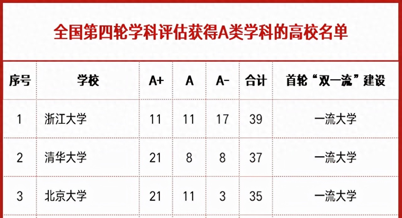 根据教育部第四轮学科评估,获得A类学科数量最多的10所“双一流”大学分别是: