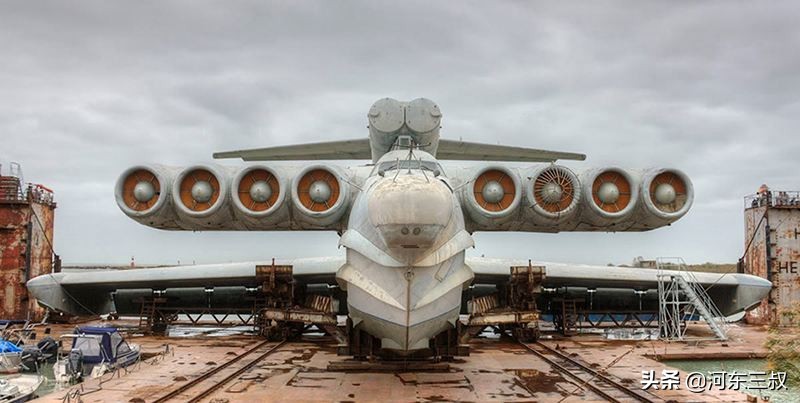 这次移动的MD-160“里海怪物”,于1986年开建,1991年完工并交付里海舰。然后碰上一个不合适的时间段,随着苏联解体成了累赘,最后退役就成了年久失修这个样子。这款“里海怪物”最大起飞重量380吨,安装8台NK-87涡扇发动机,四台一组分别安装在机头两侧。除背部庞大的6具SS-N-22“日炙”超音速反舰导弹外,机尾上部还安装了一套大型水面搜索雷达,典型的苏式狂野风格。