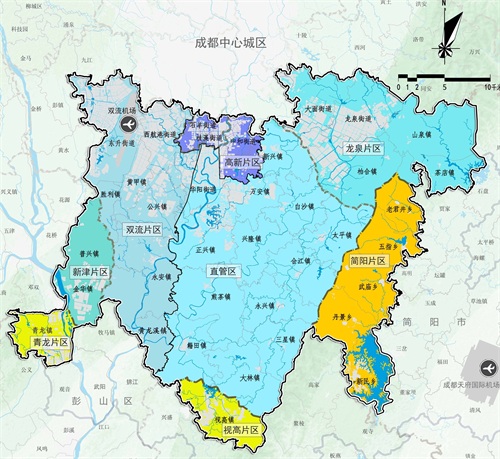 天府新区由成都片区、眉山片区、资阳片区三大片区组成,规划面积1578平方公里,范围涉及成都高新区南区、双流区、龙泉驿区、新津县(1293平方公里),眉山市彭山区、仁寿县,资阳市的简阳市,共7县,人口205万人。