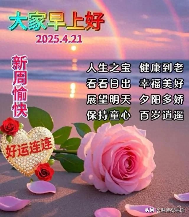 一天一个梦想,点燃新的希望;一天一个故事,每天都不一样;一天一个祝福,心情格外舒畅;一天一个问候,祝您幸福吉祥!亲爱的朋友,今天是4月21,星期一,祝愿新的一周快乐安康!早上好!☕️