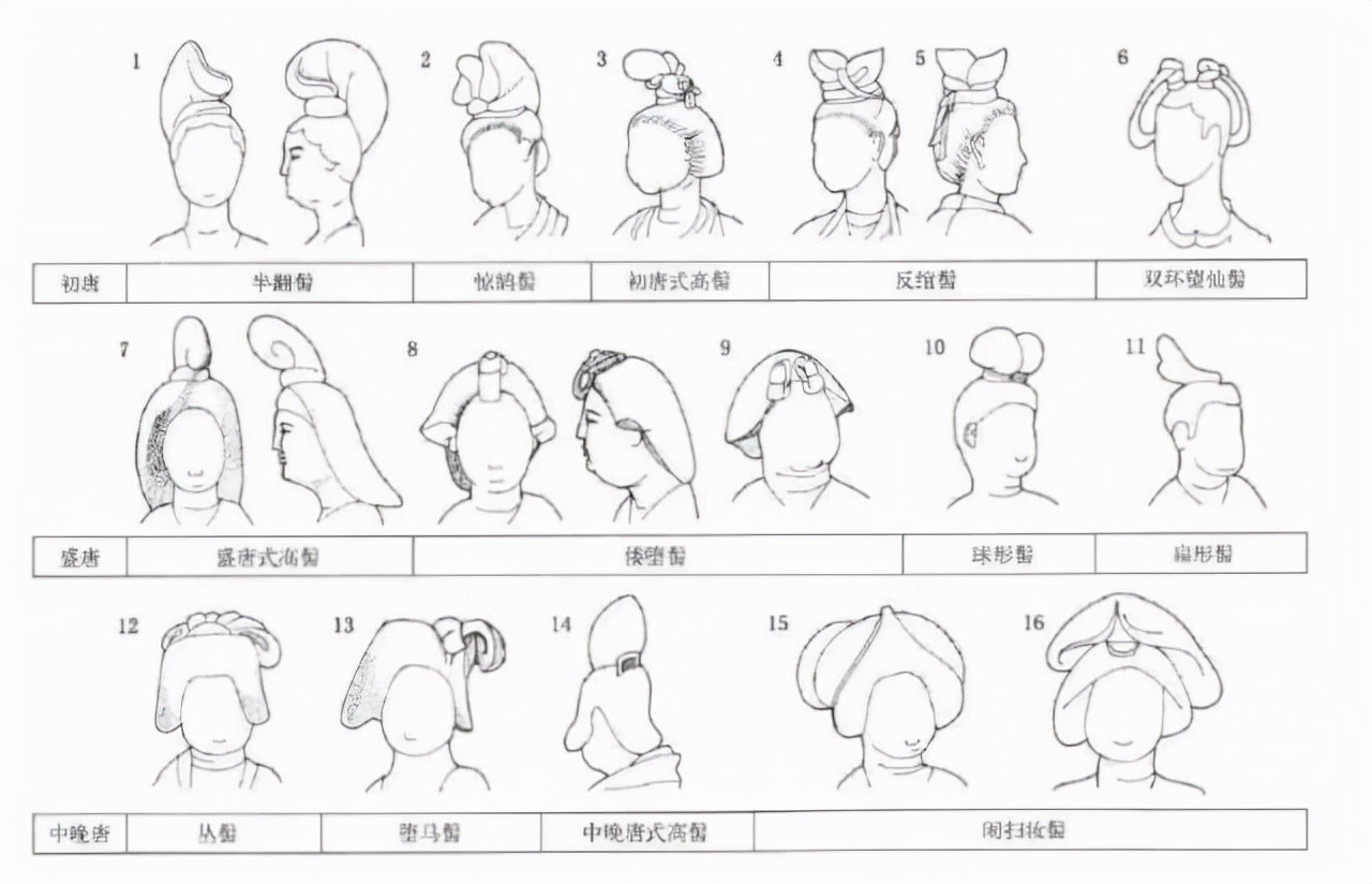 看了这么多靓丽的唐朝发型,其实我们可以做出一些总结,在唐朝初年,女俑的发髻比较低平,形式也不是很多,半翻髻是唐朝初年最流行的一种发型,到玄宗年间高髻和双鬓抱面是当时的风尚,到了天宝年间堕马髻又成了主流,而唐朝的侍女更多地是选择双垂髻。到了晚唐时期,女俑的发髻则以堕马髻和闹扫妆为主,在这里可以参考一下《唐代妇女服装与化妆》一文的线描图,来感受当时唐代女子的发型变化:
