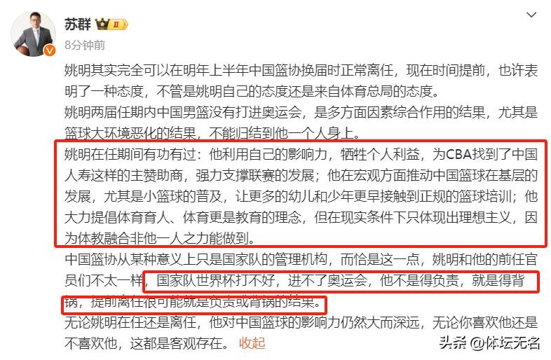 国内名嘴苏群也谈到了姚明离任,他认为大姚有功有过。姚明的功劳很多,利用自己的影响力,牺牲个人利益,为CBA找到赞助商,强力支撑联赛的发展,他在宏观方面推动了中国篮球在基层的发展,尤其是小篮球的普及,让更多的幼儿和少年更早接触到正规的篮球培训,但他大力提倡体育育人、体育更是教育的理念,在现实中只体现出理想主义,体教融合非他一人之力能做到。但中国男篮打不好世界杯,进不了奥运会,他就要负责,就要背锅,提前离任可能就是负责和背锅的结果。
