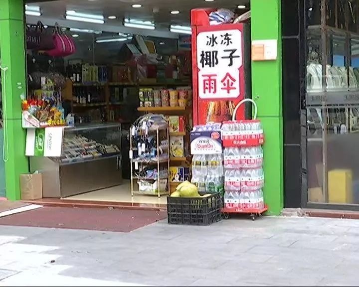 在DC商业城,一家名为“铨华专营店”同样存在出店经营的行为,店门堆放着11箱瓶装水,以及一筐椰子。
