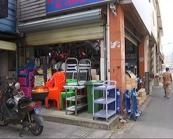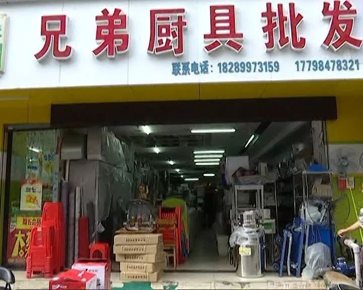 在“兄弟厨具批发”的店门口,也摆放着一些塑料椅子、板车、风扇等物品。