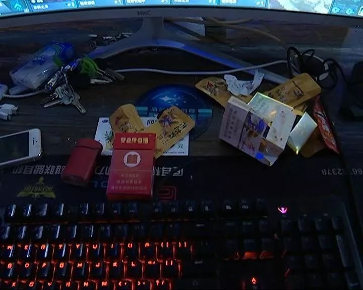 1名顾客的桌面上,则摆放着1个打火机和3个烟盒。