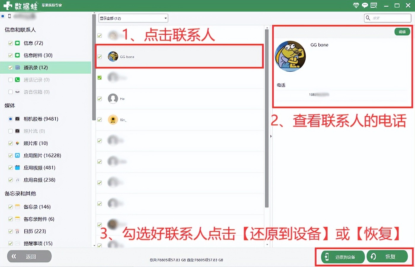 步骤4:扫描完成后,可以在【通讯录】列表里查看联系人的电话(激活后可解锁“***”),预览完成后将联系人勾选,勾选完毕后点击【还原到设备】或者【恢复】按钮。