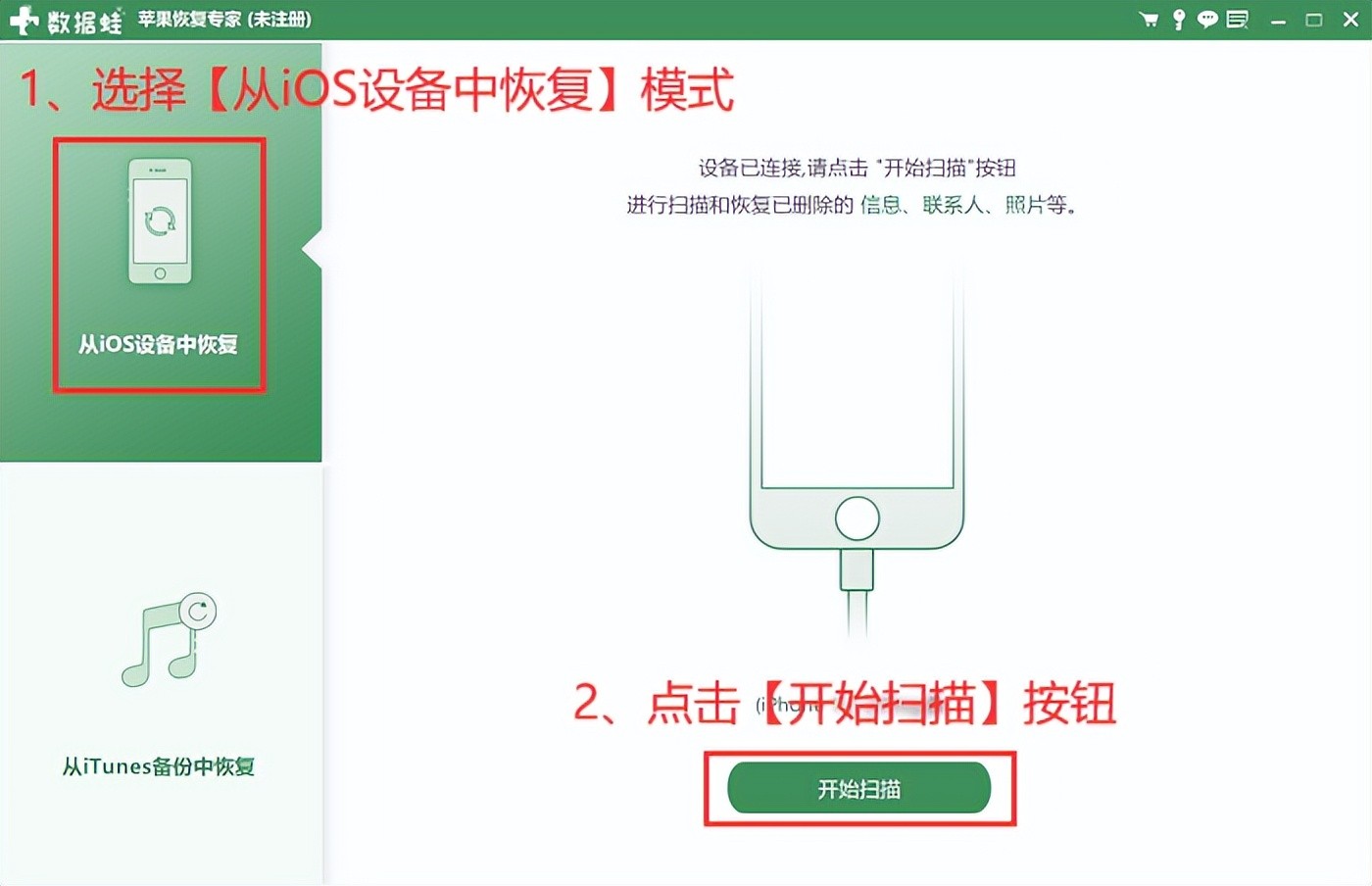 步骤3:确保选中【从iOS设备中恢复】模式的情况下,点击【开始扫描】按钮,等待软件对您的手机进行扫描。