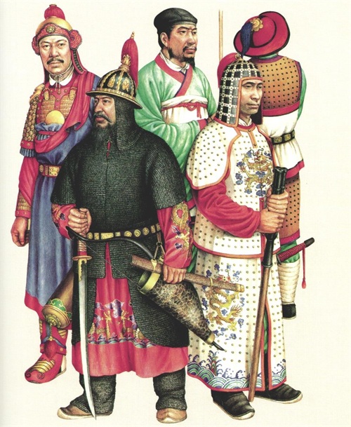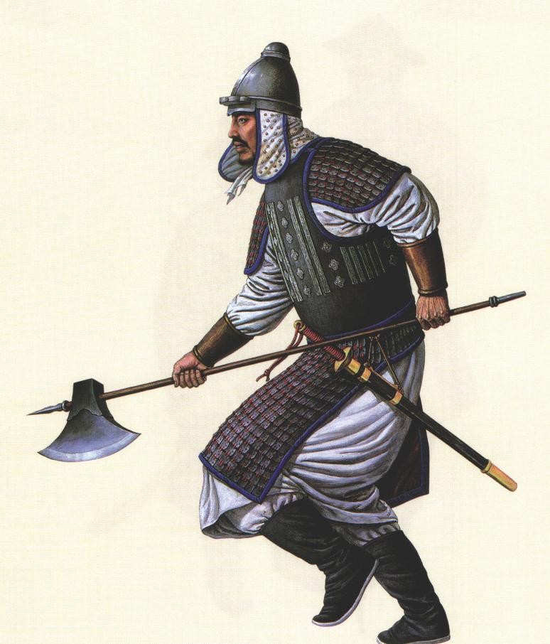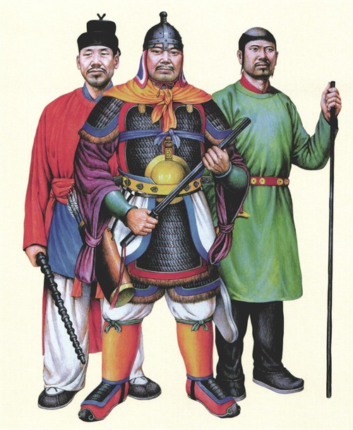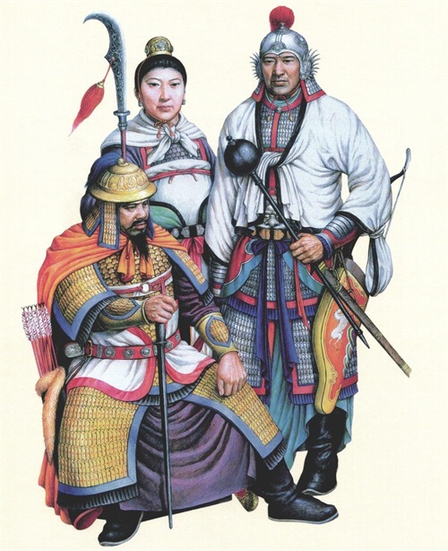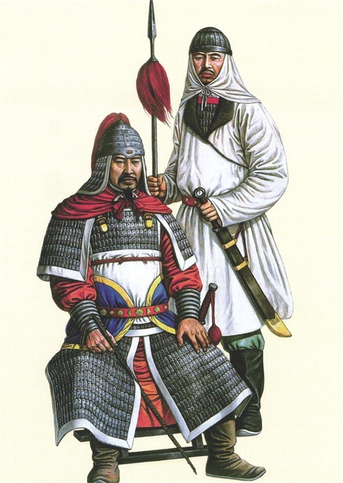 蒙古人号称上帝之鞭,纵横欧亚大陆,在盔甲上吸取了所征服地区的特色,择优而取,形制却十分混乱,铁甲、皮甲、布面甲混用。