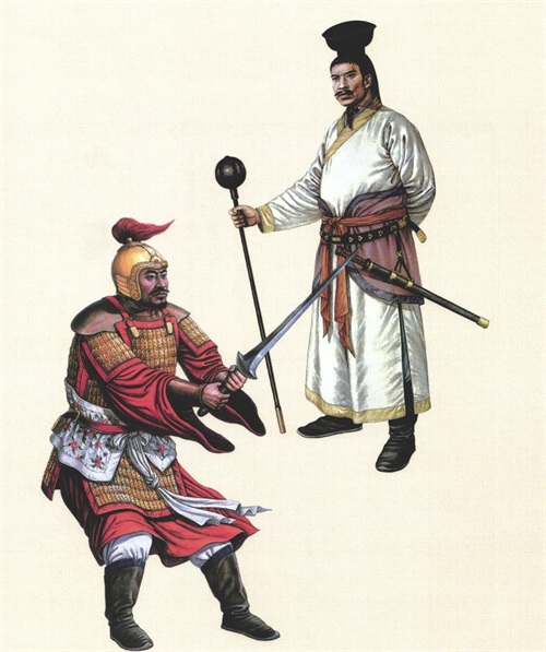 △宋代武士复原图(兵器分别为传世实物“李纲锏”和杭州岳王庙陈列实物形象)