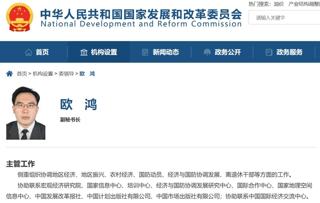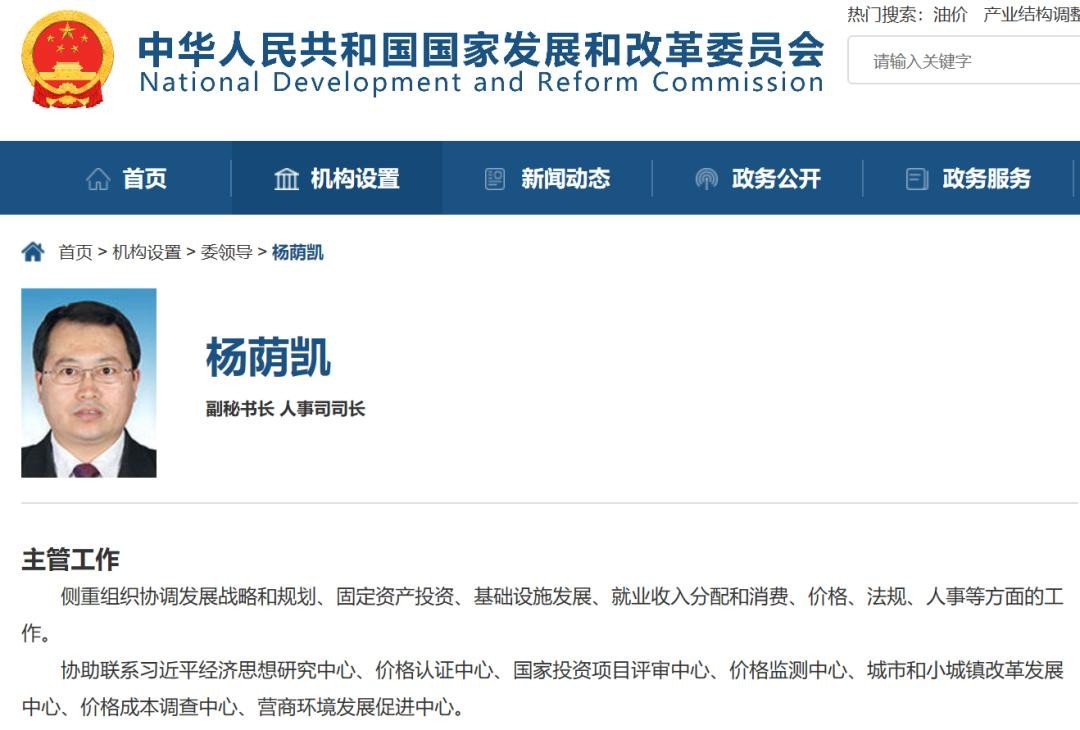 此外,原任国家发改委固定资产投资司司长的欧鸿、国家发改委人事司司长的杨荫凯均于今年4月起担任国家发改委副秘书长。