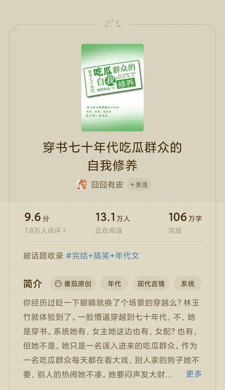 2.《穿书七十年代吃瓜群众的自我修养》作者:囧囧有皮