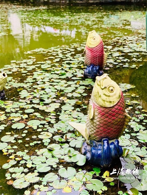 沿着曲折蜿蜒的小道闲步,便能看到一座六角平顶的凉亭,亭顶交错重叠,高低不一。亭子四周是设有多边漏窗,美景映于其中,美不胜收。亭子下是荷花池,池中遍植绿荷,池中还有三条瓷制大鲤鱼戏水吐珠。