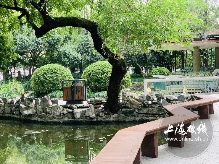 沿池还设有水榭,曲折木椅供游人休憩观景。