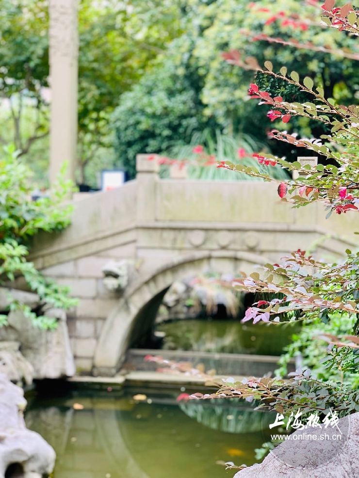 再往里便是一幅小桥流水的好景象,园内筑有一座灰石拱桥,周边繁花紧促,桥下碧绿池水,十分雅致。
