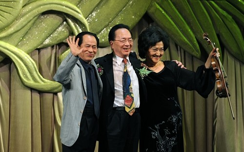 纪念《梁祝》五十周年音乐会上何占豪、陈钢、俞丽拿向观众致意