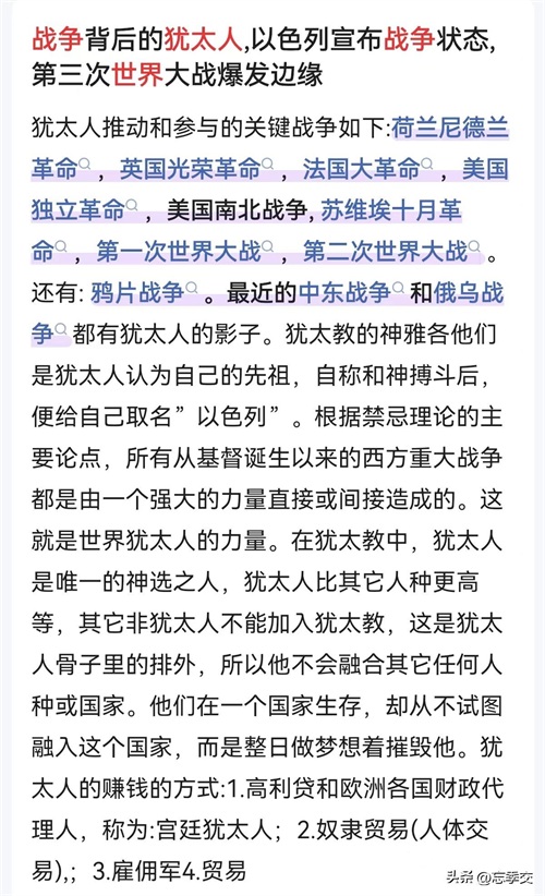 冷血无情:纵观近100年当中,世界各地的战争似乎都有犹太人的身影,在战争中,犹太人大肆掠夺资源,金钱,物资。却对流血,死亡视而不见,毫无怜悯之心。这种视他人生命为草芥,站在他国人民尸体上发财的行为,怎能会被世人所接受呢。