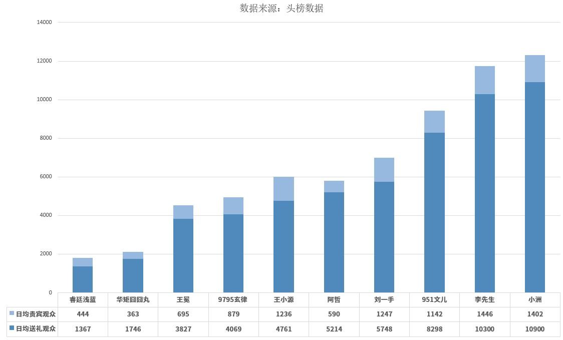 在日均送礼观众数据中,破万的直播间仅有李先生与小洲两人,这两位也分别是同周期人气榜第一、第三。而此前日均送礼观众一直同样稳定过万的阿哲,在这项数据上几乎是打了个对折。事实上,这与其直播间时长周期内过低,且开播日期相对不稳定有很大关系,在他正常开播的时间里,其人气数据对比可以看出并没有出现大幅下滑。