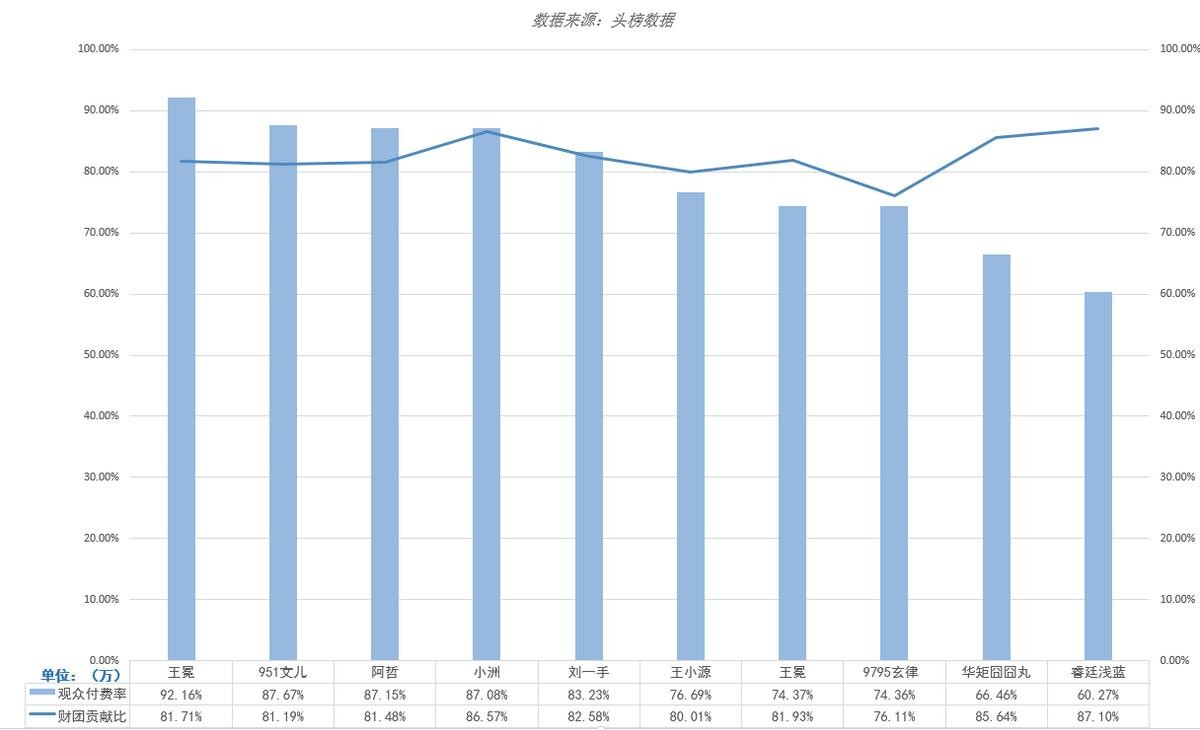 阿哲、李先生、小洲、王冕等此前都曾因各种原因停播,在近两个月这些头部主播陆续回归,再度让YY平台重回“诸神时期”。而这些人气、吸金力兼具的头部主播们,铁粉支持率高,也意味着观众付费率高。收入冠军文儿直播间观众付费率排行第二位,拿下第一位的则是王冕,去年持续霸占YY主播人气榜冠军的阿哲,排行第三位。