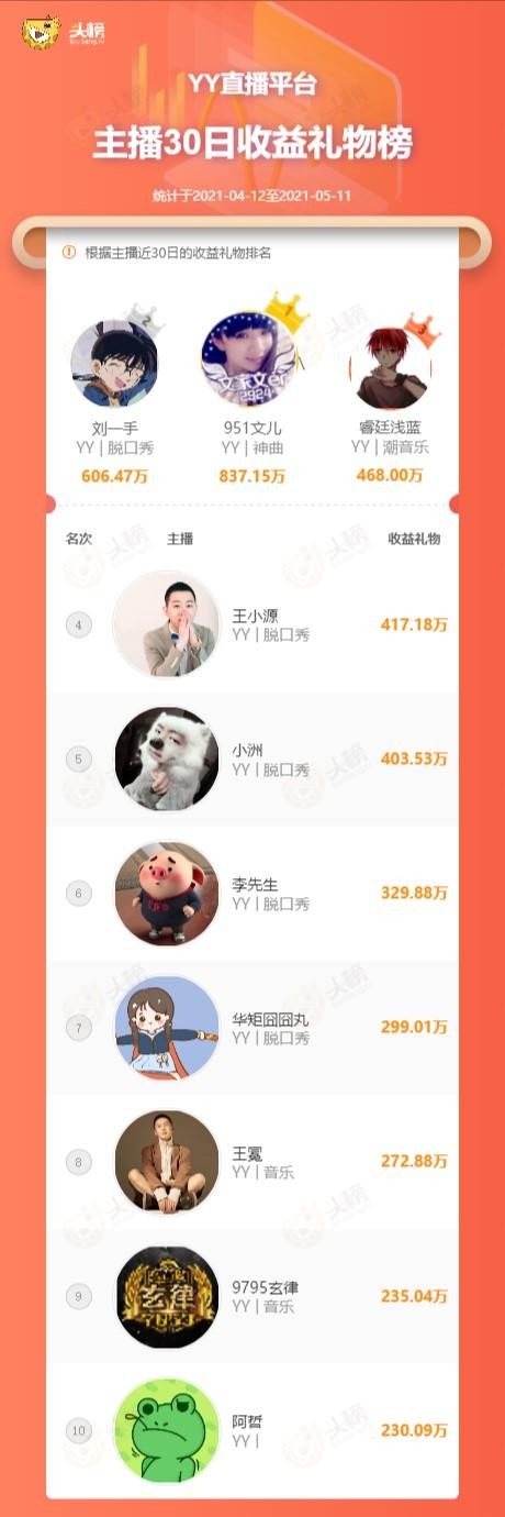 在YY近三十天主播收益礼物榜TOP10中,入围门槛高达230万,且进榜主播几乎是常年稳定在前十的状态,月流水营收保持200w+。本期YY收入冠军由文儿以837万拿下。