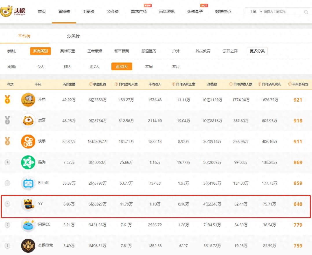 在头榜有统计的九大平台中,YY平台这位“老前辈”在东家变更后,似乎并未发生大规模变动。平台影响力综合排行第六位,周期内活跃主播人数同样处于第六位,但这六万活跃主播却为YY带来了6.6亿元的流水,主播平均收入1.1万元,排行平台第二位,作为“泛娱乐老大哥”其平台下主播吸金力可见一斑。