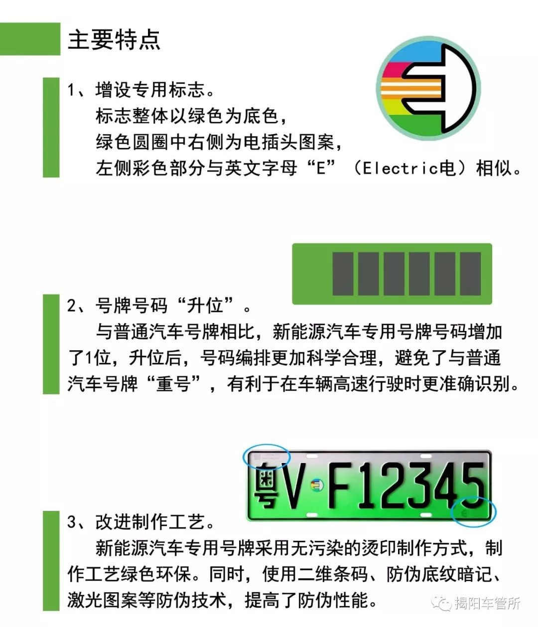新号牌式样体现“绿色、环保、科技”寓意,以绿色为主色调,增加了专用标识,采用新式样、新材料、新工艺以及新的防伪技术,既可实现区分管理、便于识别,又能彰显新能源特色、技术创新。其中,小型新能源汽车专用号牌底色采用渐变绿色,大型新能源汽车专用号牌底色采用黄绿双拼色。