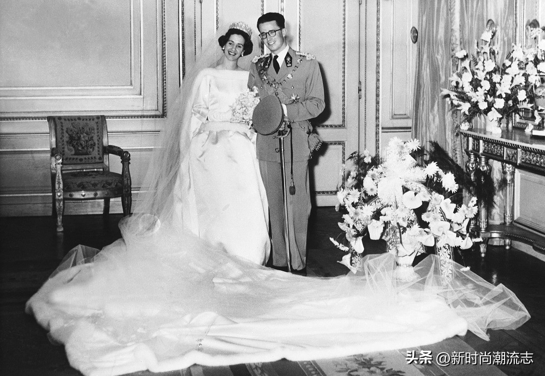 比利时博杜安国王与身穿 Balenciaga 婚纱的法比奥拉王后,1960年