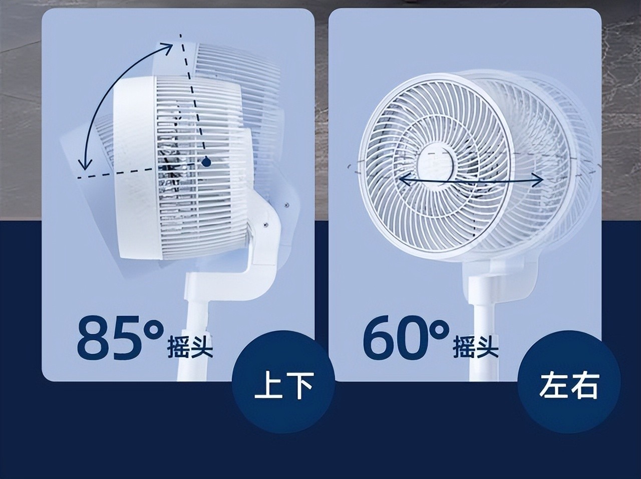 这款空气循环扇可以85°上下摇头”、“60°左右摇头”,还有“8挡位调整风速”,大角度地摇头,让风束触动的范围更广,能更快速地搅动室内空气。
