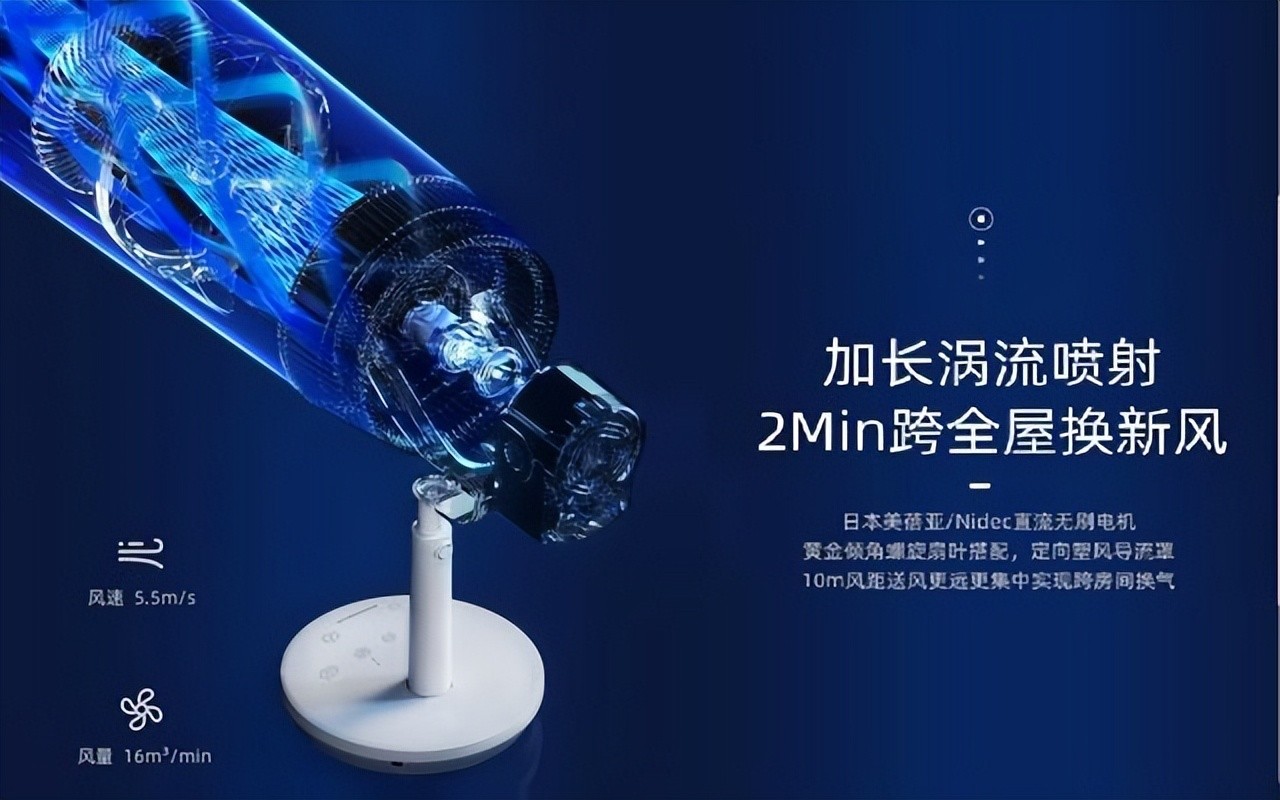 首先是搭载直流无刷电机,转动更平滑、转速更快,黄金倾角螺旋扇叶,搭配定向塑风导流罩,能做到以5.5m/s风速、20米超长送风距离快速推动全屋空气流动,让吹风不受空间和距离阻碍。