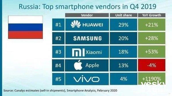 2月13日消息,近两年国内手机品牌迅速崛起,不仅受到了国内用户的喜欢,同时也受到了海外用户的青睐。近日,知名市场调研机构Canalys公布了一份2019年第四季度俄罗斯手机市场份额的调查报告。从该榜单来看,销量前五名中国手机产商占据了3席。