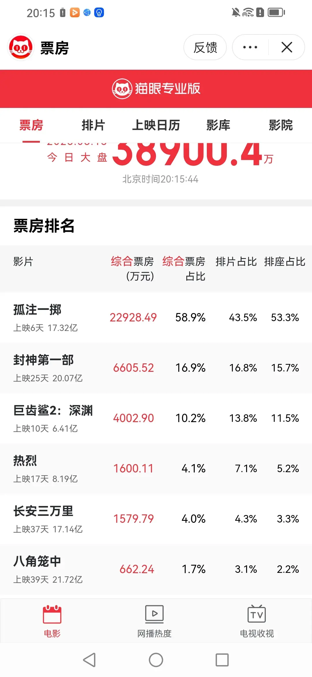 排名第五位的是【长安三万里】今天目前票房是1579.79万元,上映37天累计票房17.14亿。长安三万里后劲太强了,今天总票房突破17个亿,今天单日票房甚至一度超越热烈。