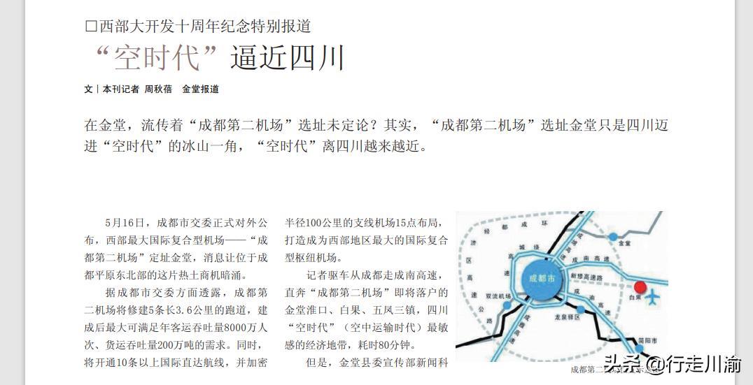 2009年,曾经有杂志以《空时代逼近四川为题》报道了成都第二机场正式落户金堂的消息,文章称:
