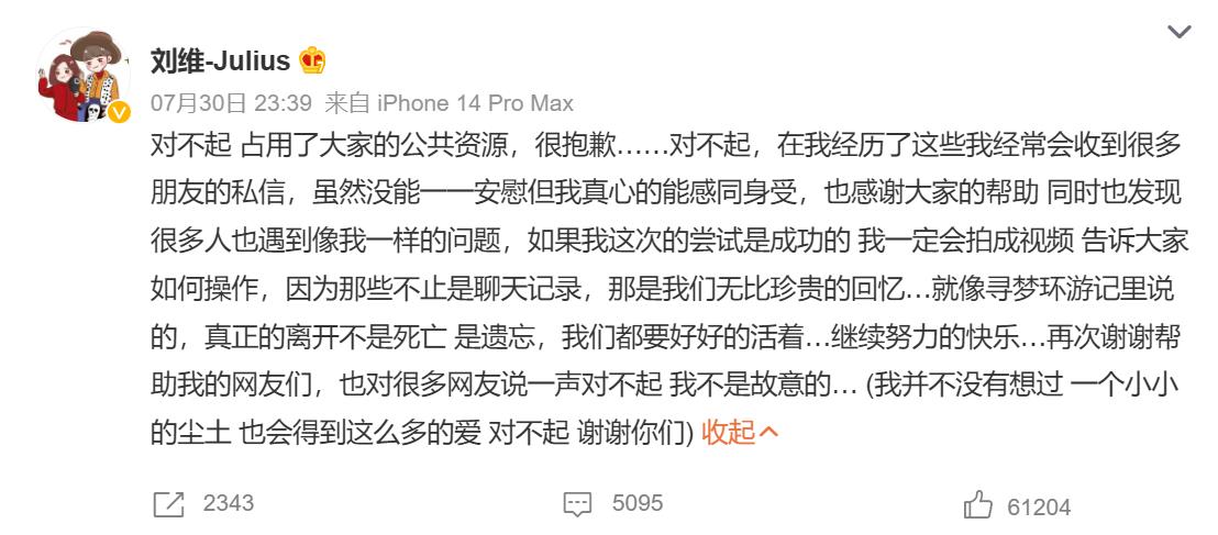 刘维作为一个普通的儿子,失去母亲对于他来说无疑是一次巨大的打击。电子设备中储存着母亲最后的痕迹,对刘维来说可能具有特殊的情感意义。他登不上母亲微信的事实,可能让他感到与母亲的联系中断,失去了一种重要的情感支持。因此,在微博上发出求助,寻找帮助解决问题,也是刘维一种发泄内心、留住回忆的方式。作为一个公众人物,他希望通过曝光这个问题,引起社会的关注,获得可能的解决方案。