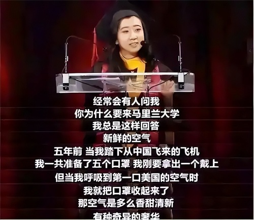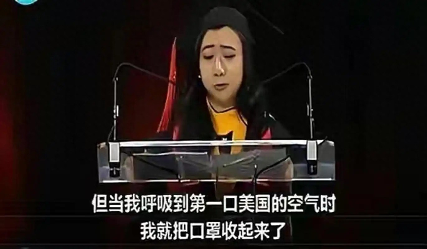 2017年,一名留美大学生为了拿到美国绿卡,在毕业典礼上公然跪舔美国,言辞之谄媚令人发指,直言:“美国的空气太香甜,在中国出门不戴口罩会生病!”