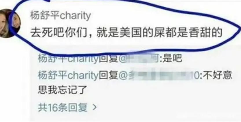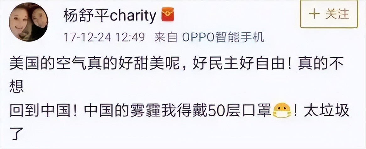 当初由于网上对杨舒平质疑的声音很多,索性她也不装了,直言美国的屎都是香甜的,还说中国人是“死番薯”,说自己已经拿到了美国绿卡,而且自己虽然不想回到那个污染严重的地方,但是就算回国别人也管不着。