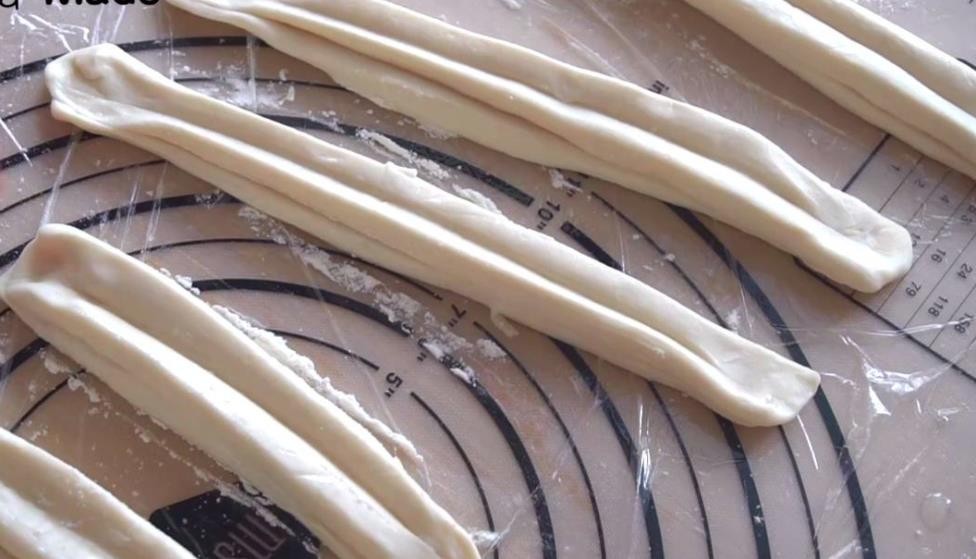 第三步,案板上涂抹上食用油,然后取出醒发好的面团,擀成扁平的长条,然后切成一个个宽条,每两个叠加起来,用筷子压一下。