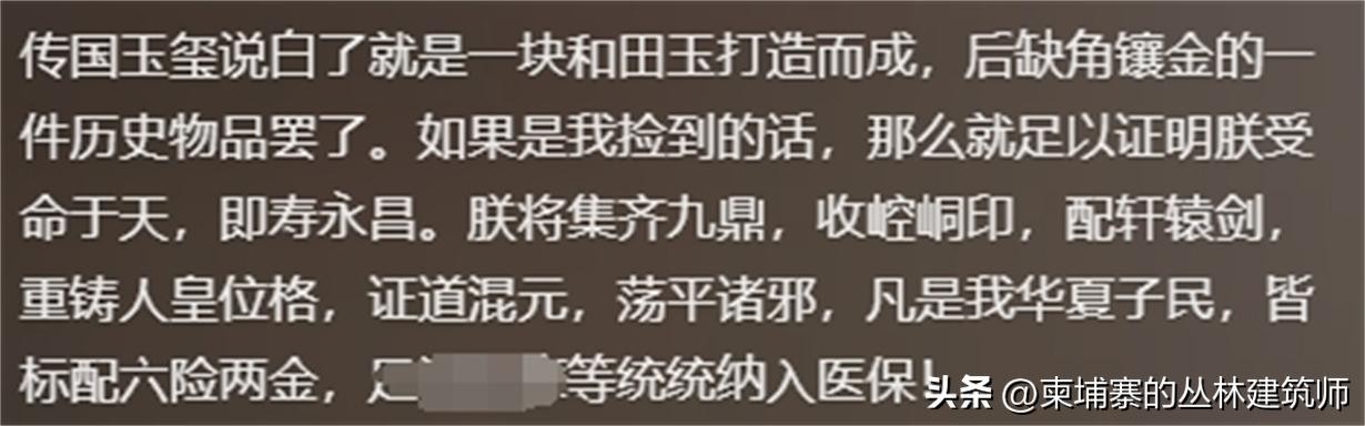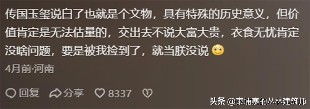 简简单单的八个字就能硬控华夏男儿几千年,有网友这样问:传国玉玺和蒙娜丽莎哪个更值钱?就这么说吧在中国用传国玉玺随便在一张纸上盖上这几个字,都随便比那蒙娜丽莎值钱。因为对我们来说,传国玉玺所承载的受命于天,既寿永昌!就连三国时期的袁术史书上记载的都是驾崩!假如你捡到传国玉玺你会怎么办?下面网友分享让人大开眼界!